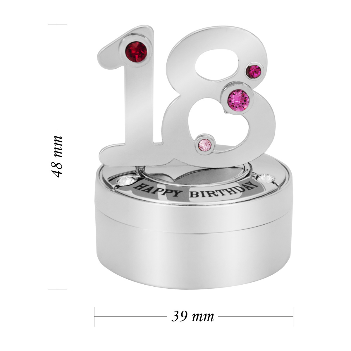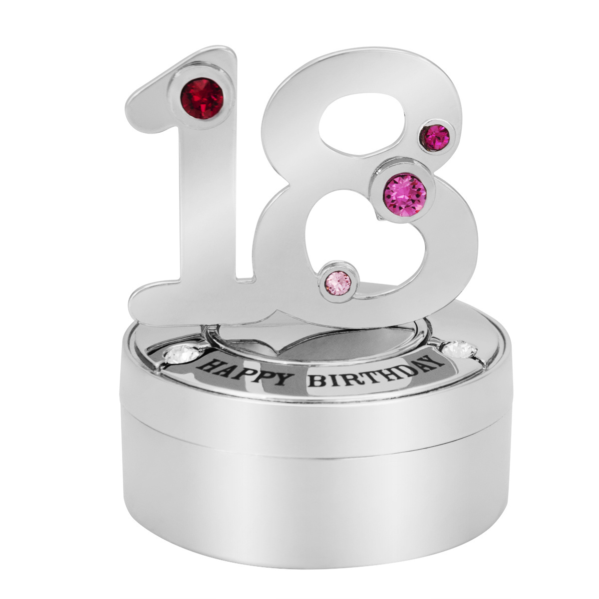 Szkatułka na biżuterię to prezent praktyczny i niezwykle dekoracyjny. Precyzyjnie wykonana metalowa figurka ozdobiona została pięknymi kryształkami. Różowe i białe kamienie tworzą doskonały efekt w połączeniu ze srebrnym odcieniem szkatułki. Zwieńczona symboliczną liczbą i napisem Happy Birthday figurka doskonale ozdobi młodzieżowy pokój.