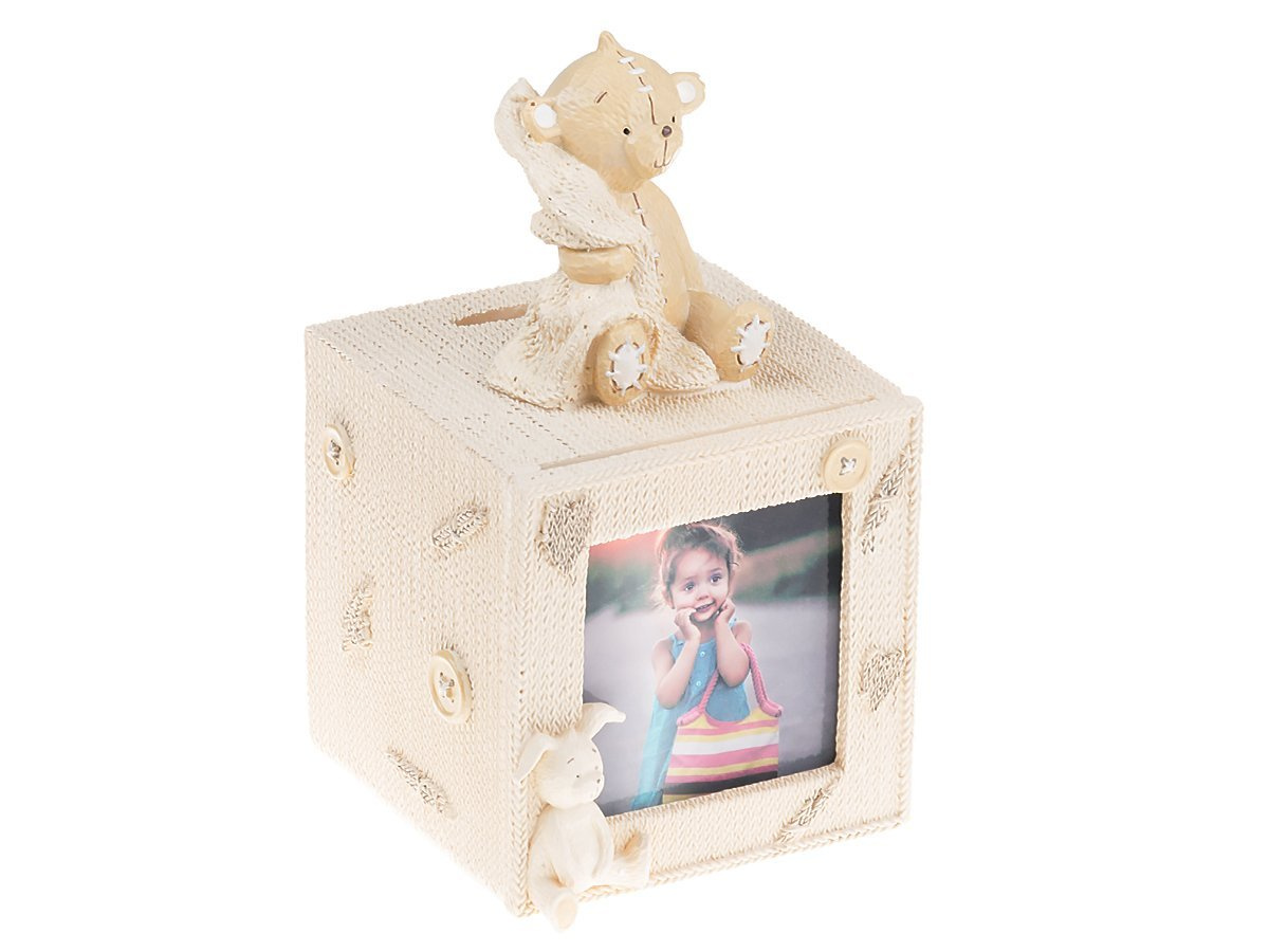 Proponujemy Państwu śliczną skarbonkę pomalowaną na żółto-beżowy kolor. Na wieczku został umieszczony miś z kocykiem. Z przodu skarbonki jest miejsce aby umieścić zdjęcie.
