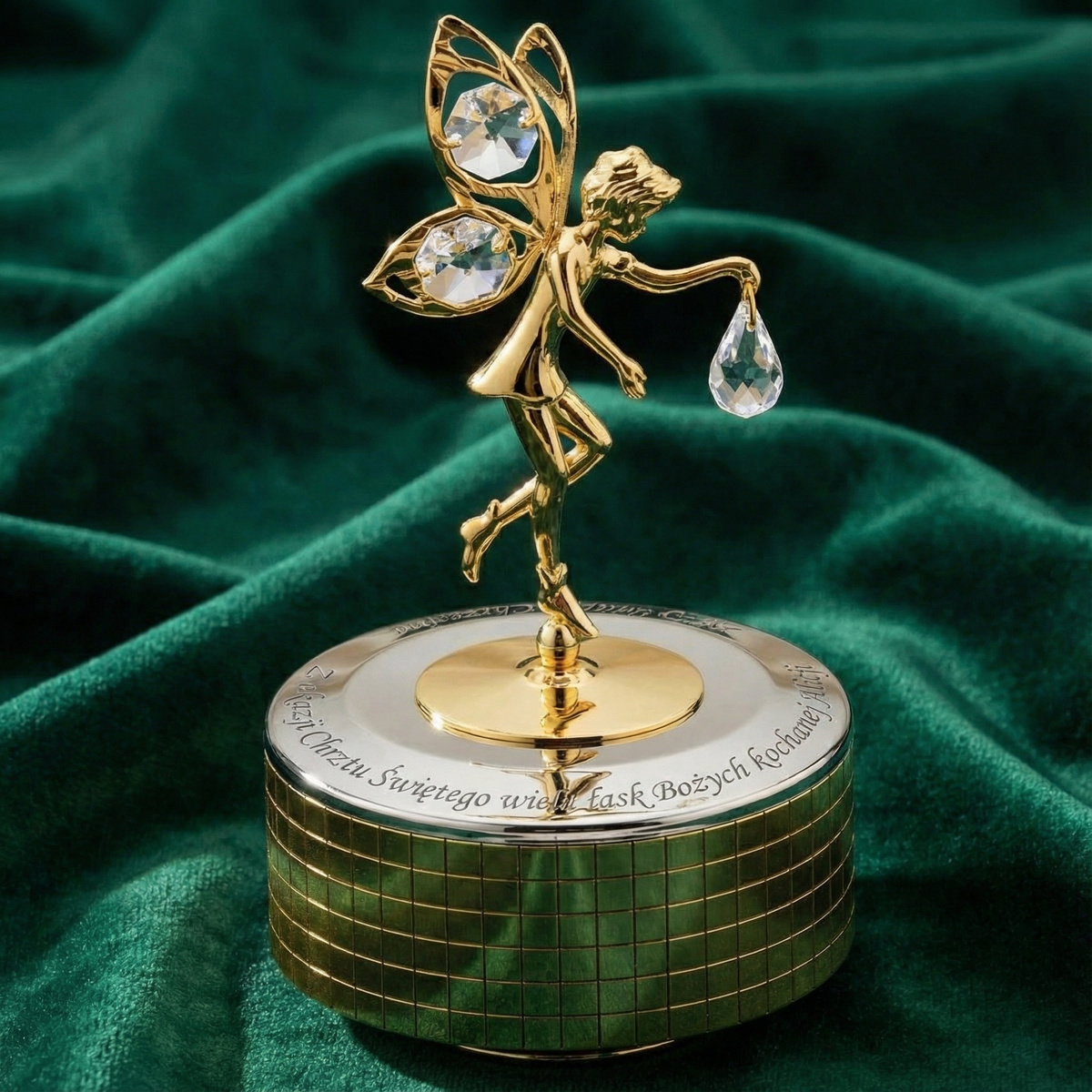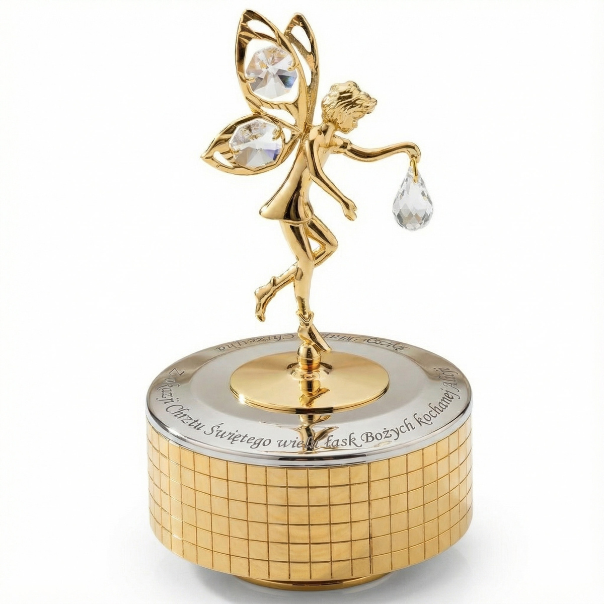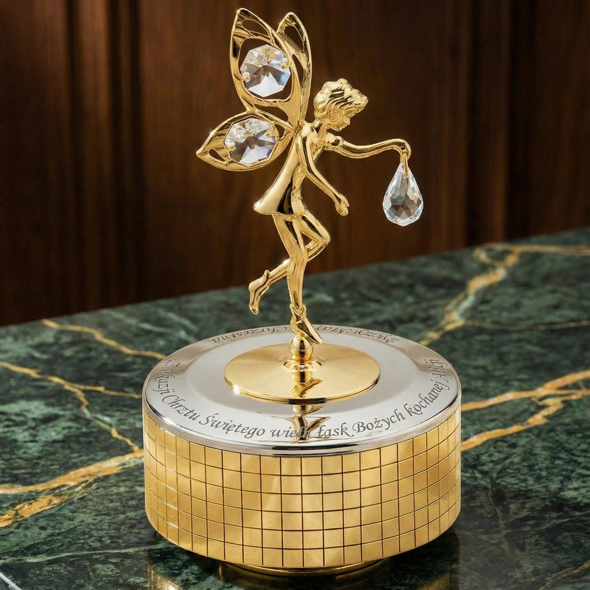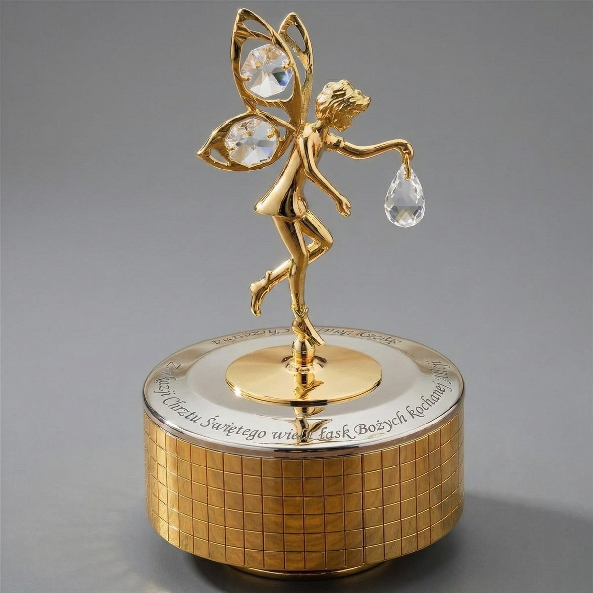 Śliczna platerowana 24 - karatowym złotem pozytywka elf z oryginalnymi kryształami Swarovskiego.  Pozytywka jest nowa, zapakowana w oryginalne pudełko.  Charakteryzuje się elegancją oraz bardzo wysoką jakością wykonania. Pozytywkę nakręca się od spodu, a ona obraca się wokół własnej osi - gra melodię.