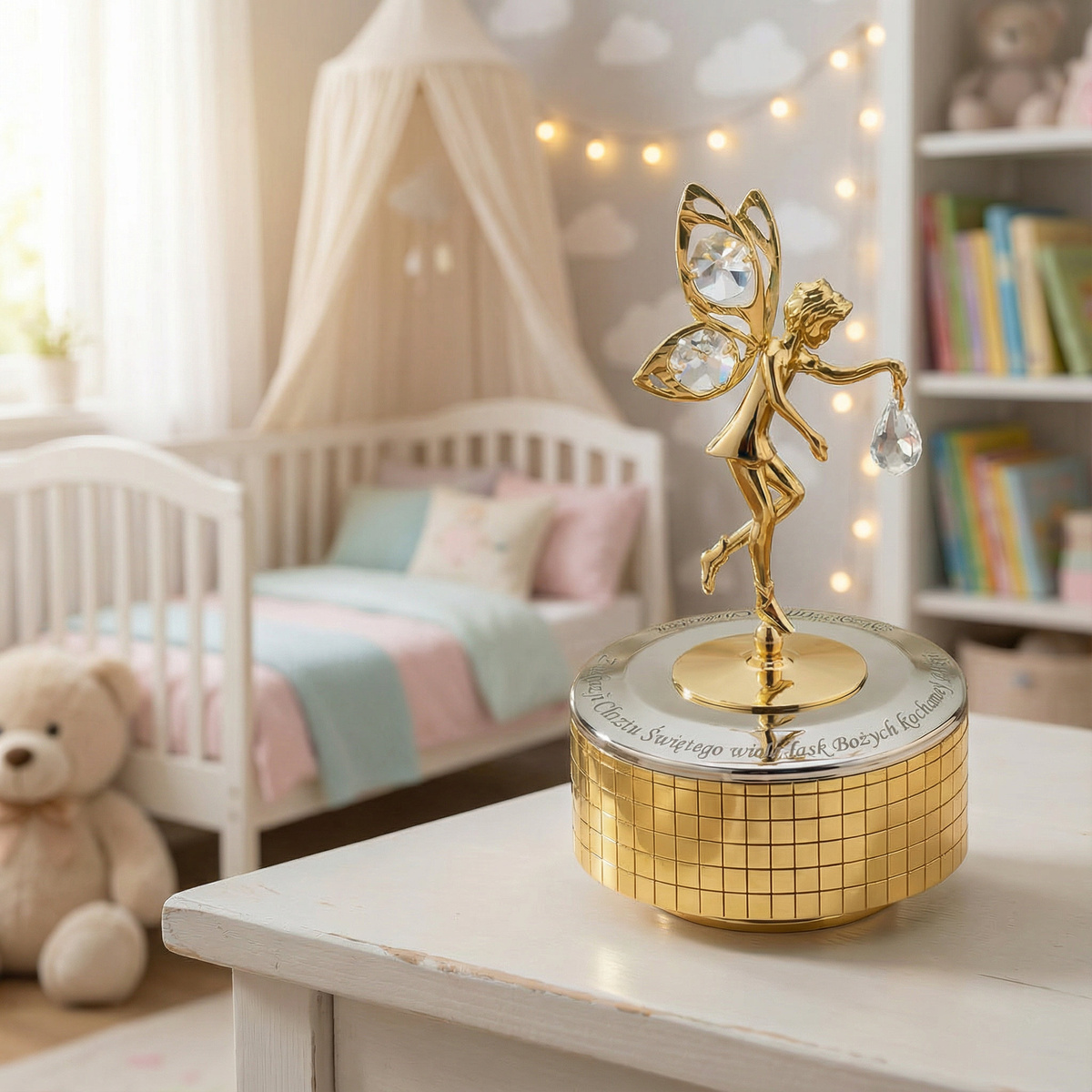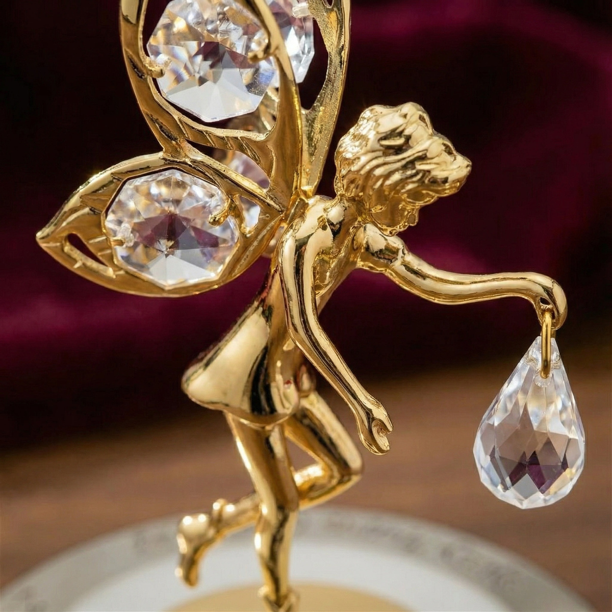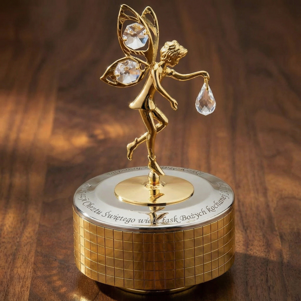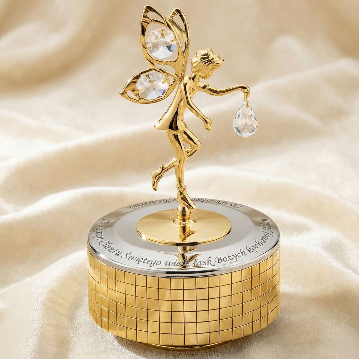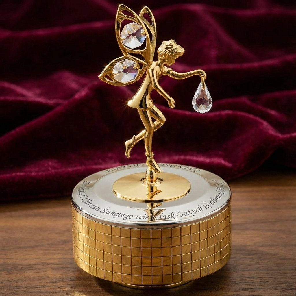 Śliczna platerowana 24 - karatowym złotem pozytywka elf z oryginalnymi kryształami Swarovskiego.  Pozytywka jest nowa, zapakowana w oryginalne pudełko.  Charakteryzuje się elegancją oraz bardzo wysoką jakością wykonania. Pozytywkę nakręca się od spodu, a ona obraca się wokół własnej osi - gra melodię.