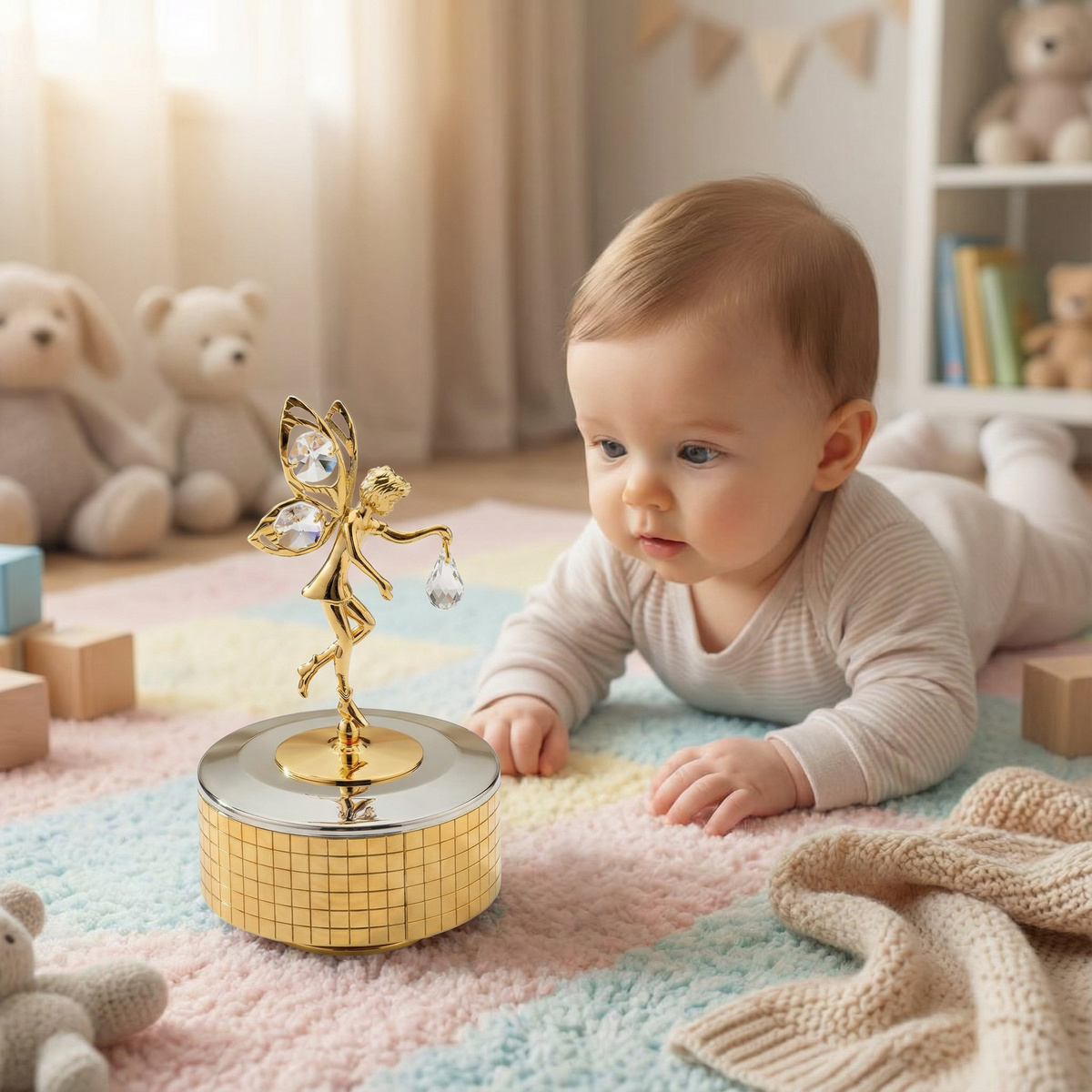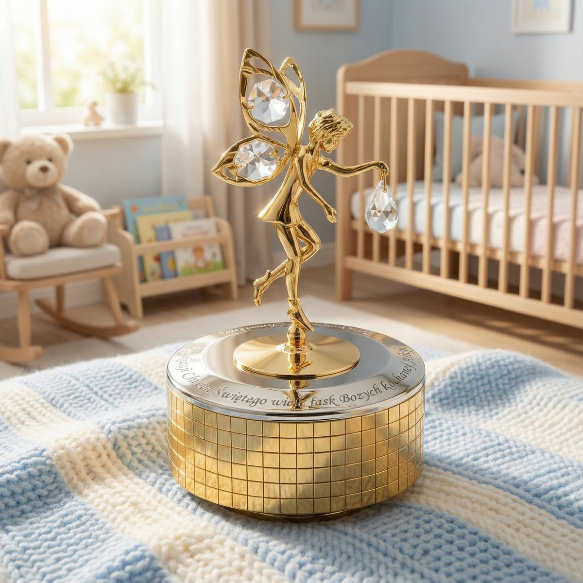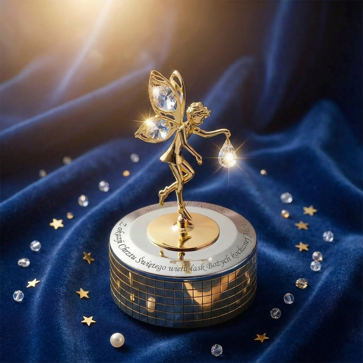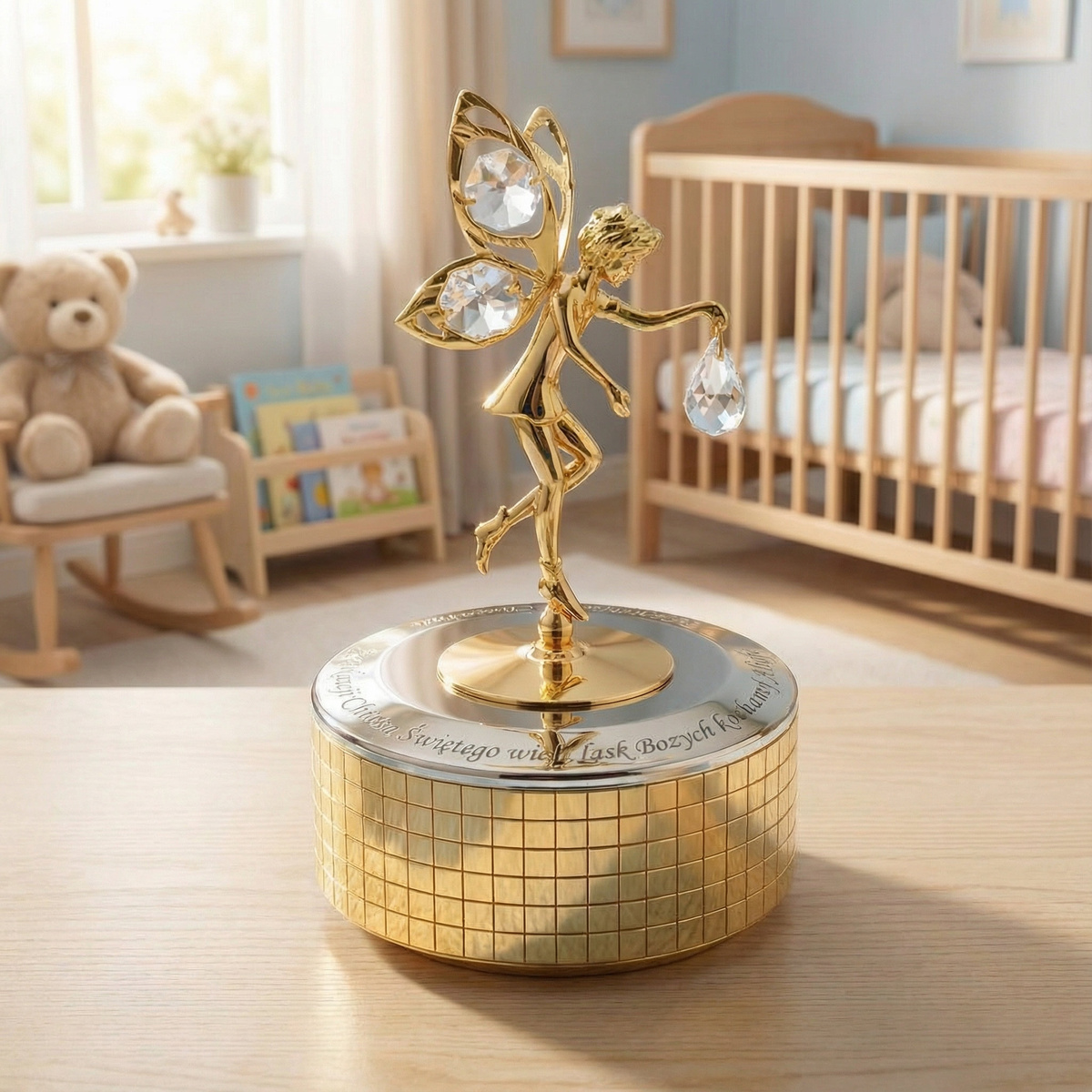 Śliczna platerowana 24 - karatowym złotem pozytywka elf z oryginalnymi kryształami Swarovskiego.  Pozytywka jest nowa, zapakowana w oryginalne pudełko.  Charakteryzuje się elegancją oraz bardzo wysoką jakością wykonania. Pozytywkę nakręca się od spodu, a ona obraca się wokół własnej osi - gra melodię.