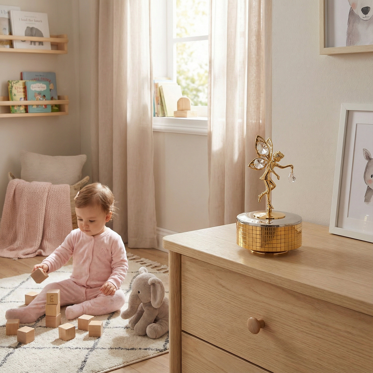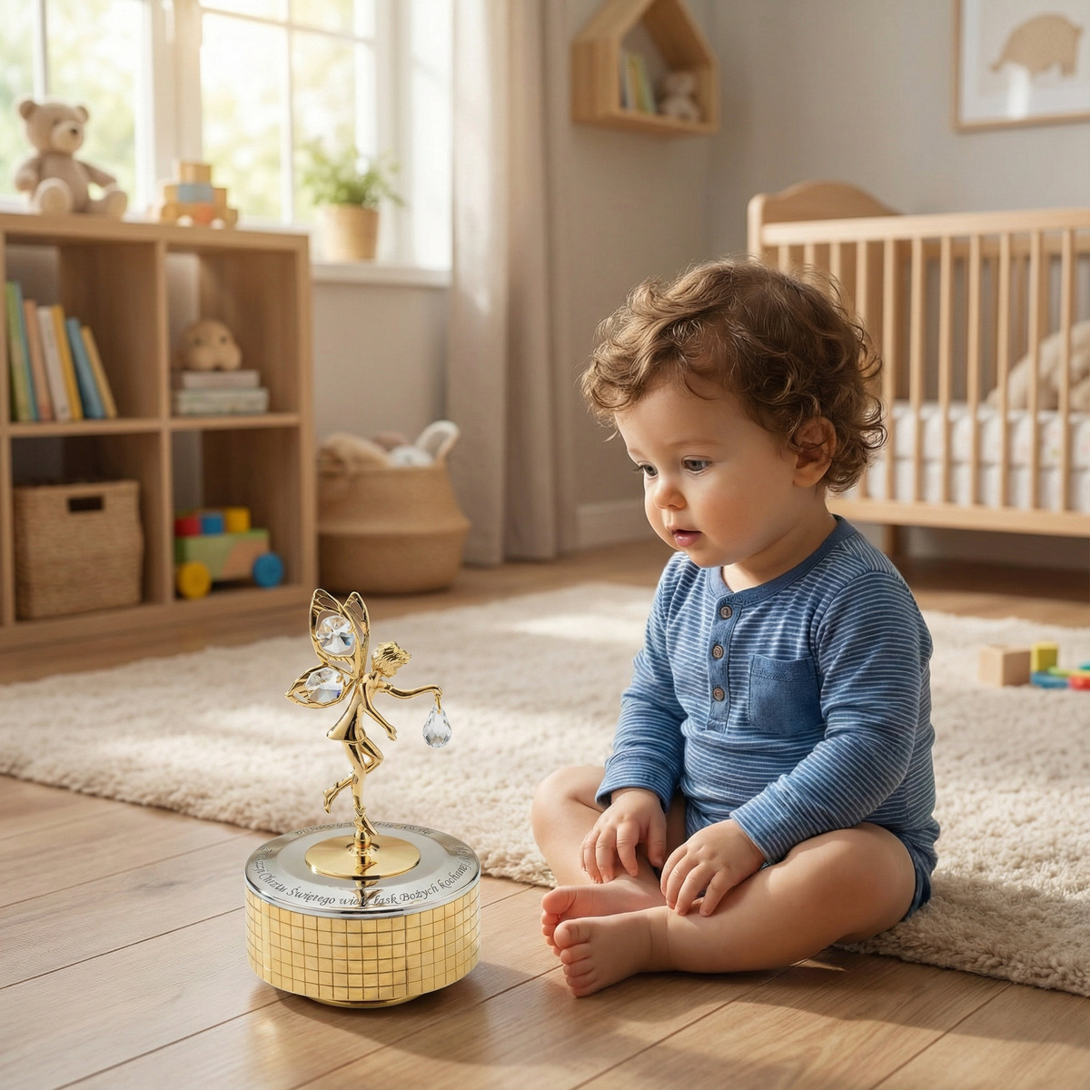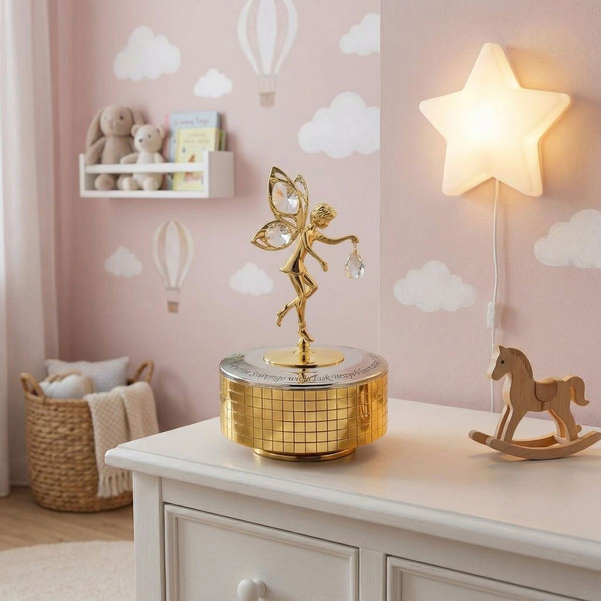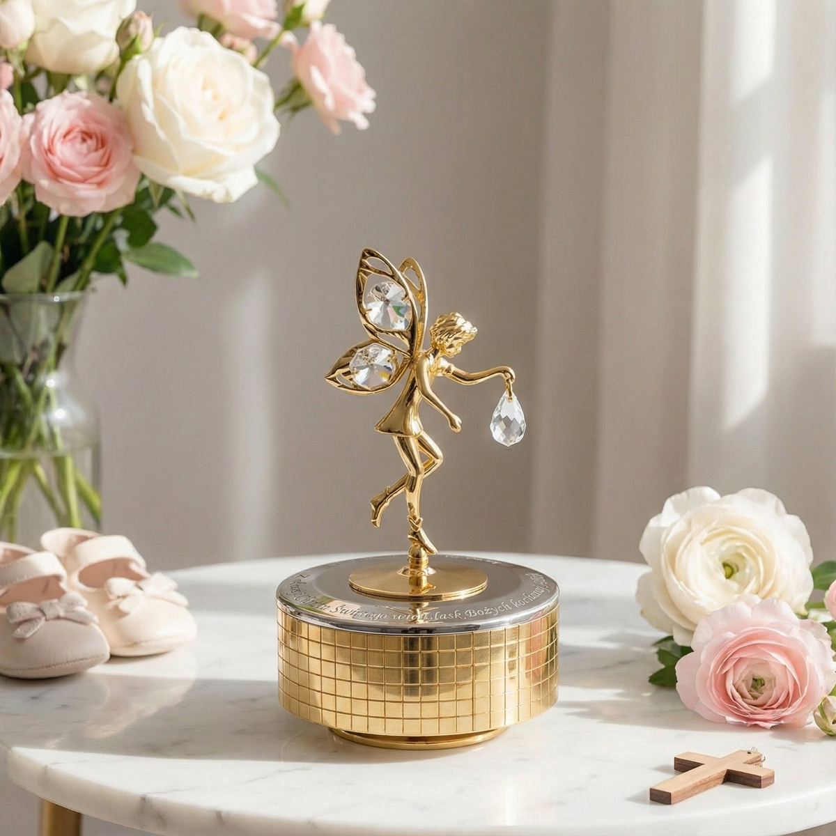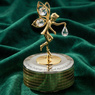 Śliczna platerowana 24 - karatowym złotem pozytywka elf z oryginalnymi kryształami Swarovskiego.  Pozytywka jest nowa, zapakowana w oryginalne pudełko.  Charakteryzuje się elegancją oraz bardzo wysoką jakością wykonania. Pozytywkę nakręca się od spodu, a ona obraca się wokół własnej osi - gra melodię.
