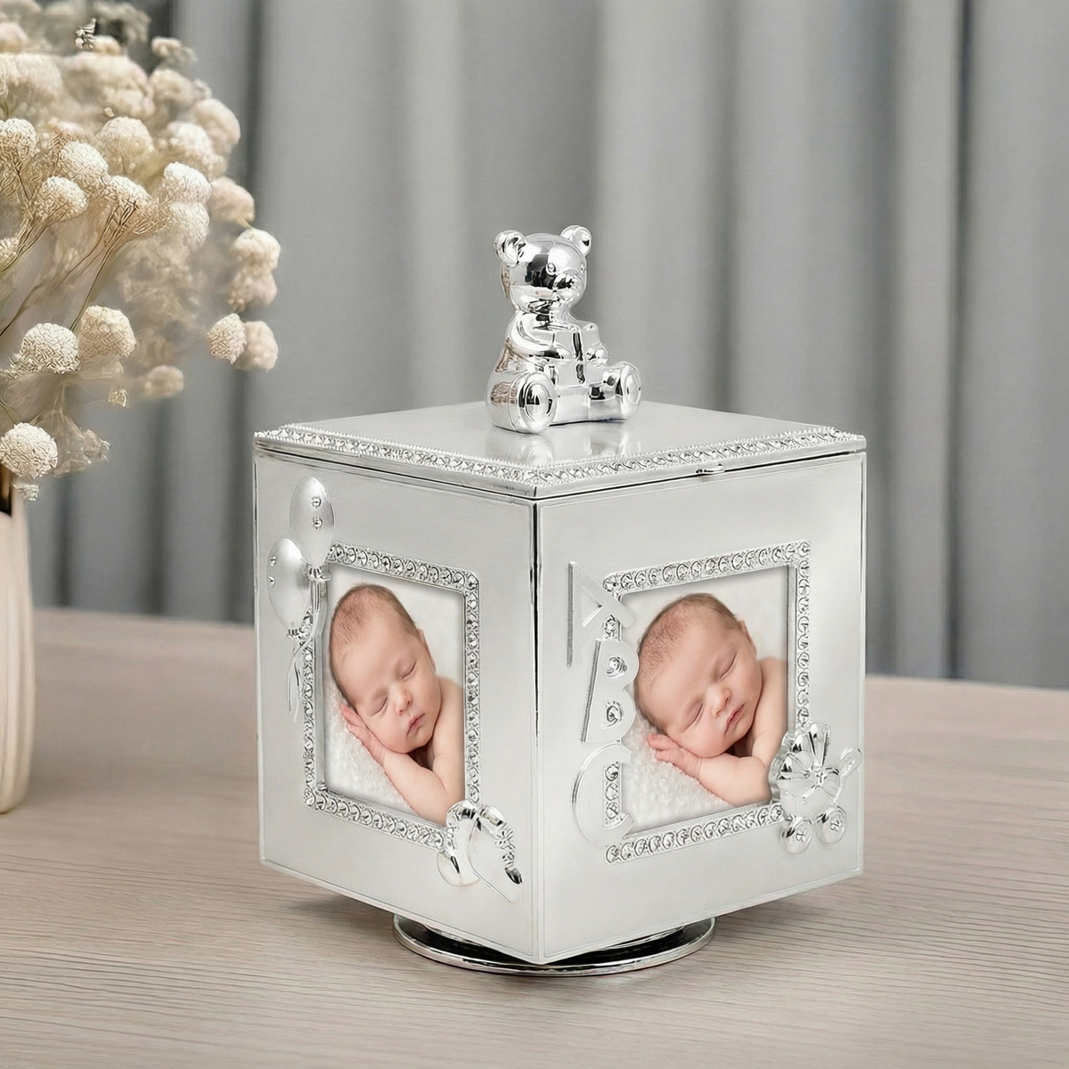posrebrzana karuzela z pozytywką. Pamiątka wykonana jest z wysokiej jakości stali posrebrzanej i zabezpieczonej lakierem ochronnym, dzięki któremu nie czarnieje i zachowuje swój blask. W każdym koniku, który obraca się wokół własnej osi, można umieścić 4 zdjęcia. Aby pozytywka zaczęła wygrywać melodię, wystarczy ją nakręcić.