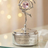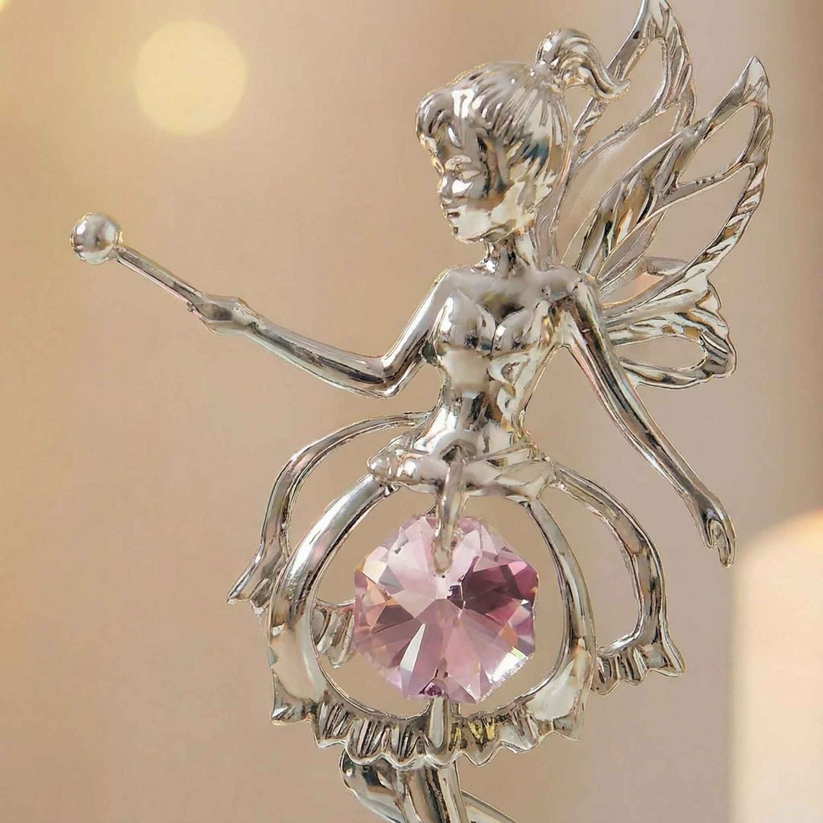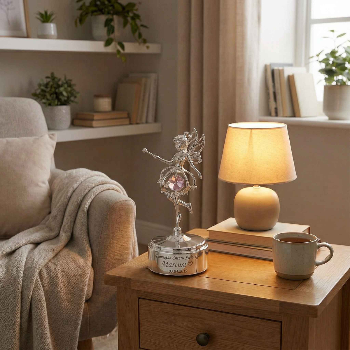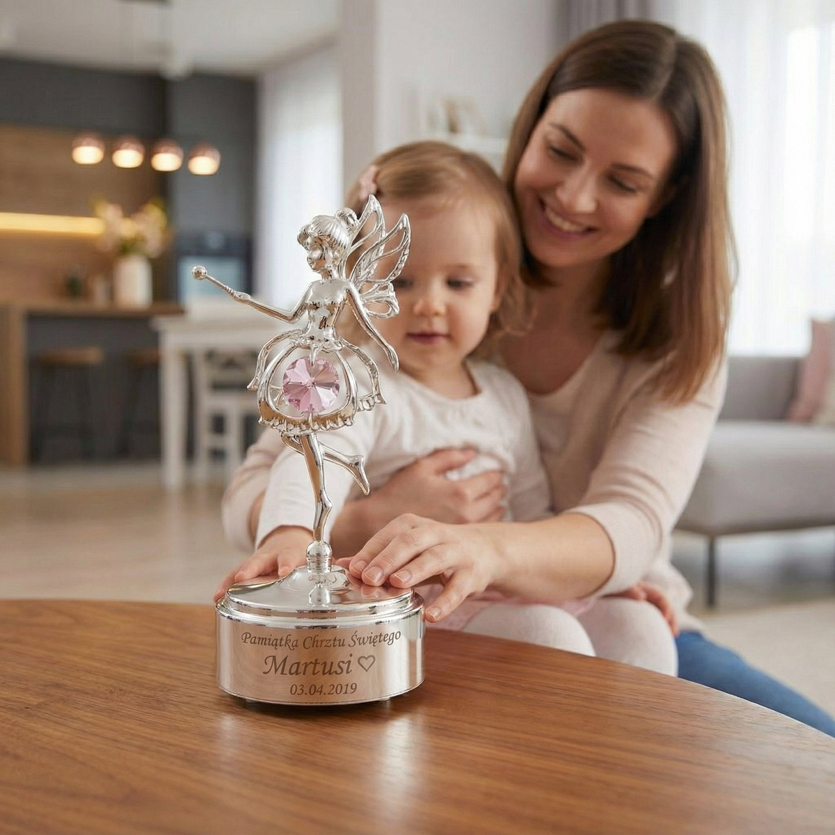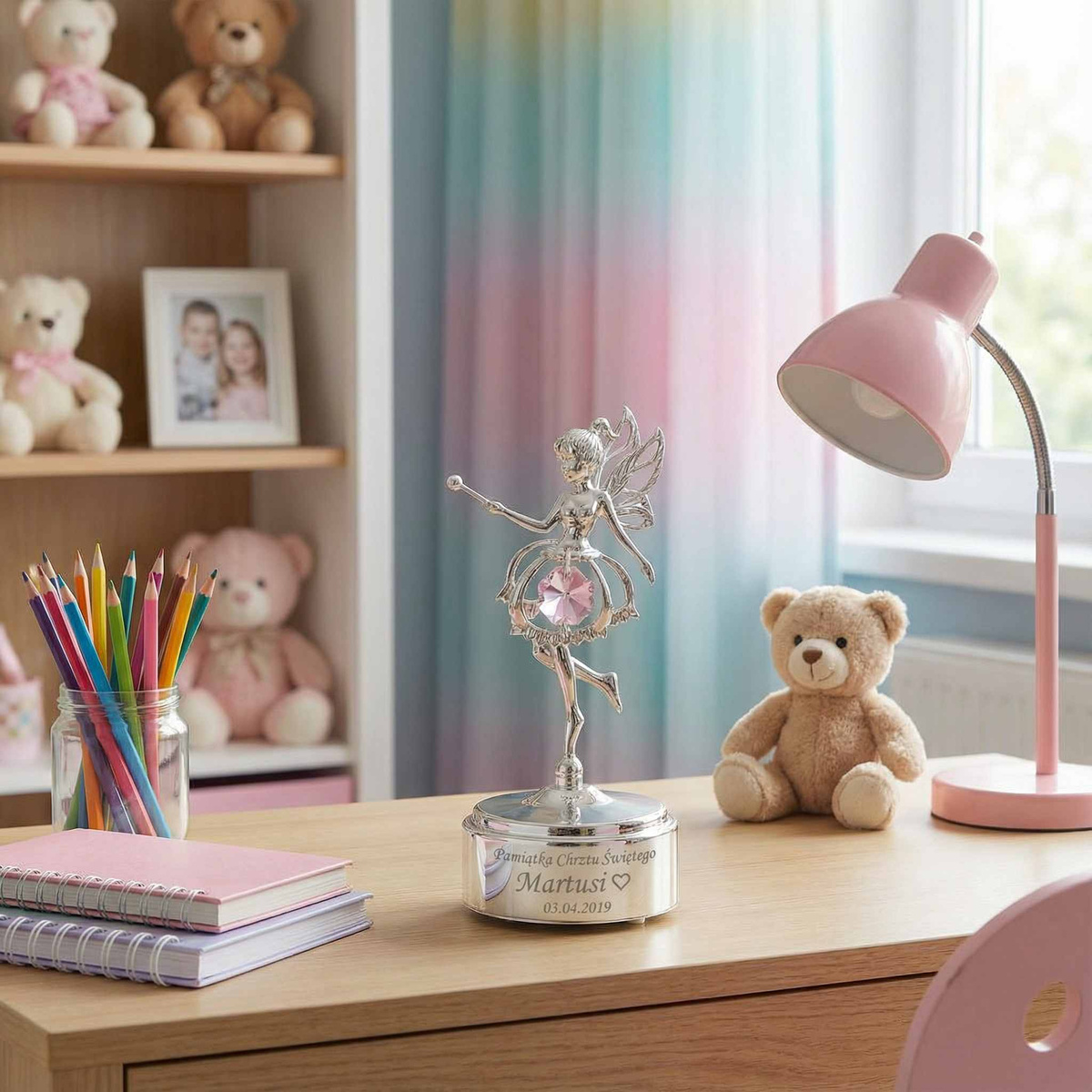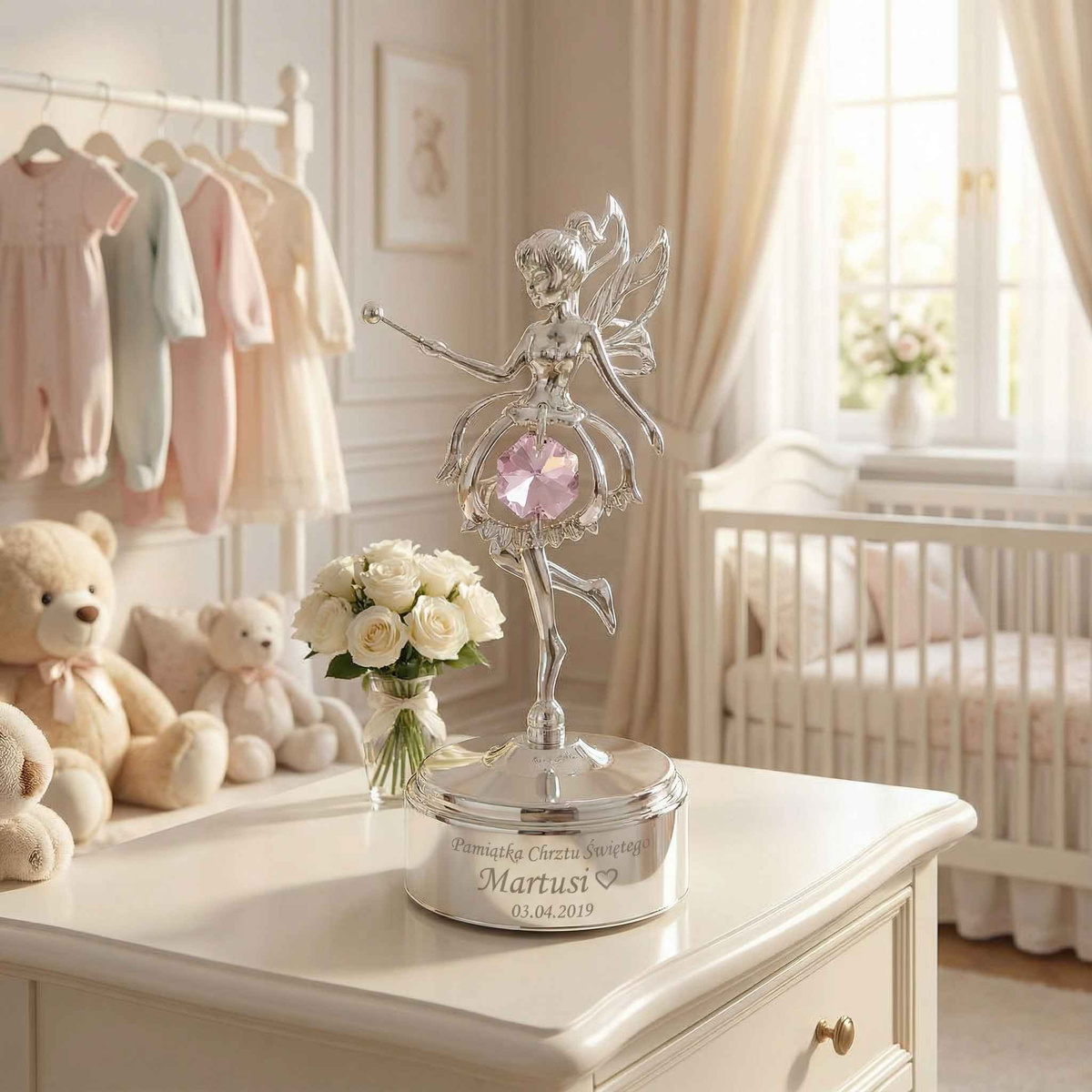 Prześliczna posrebrzana mała pozytywka z dziewczynką elfem ozdobiona różowym oryginalnym kryształem Swarovskiego. Pozytywkę nakręca się od spodu, a ona obraca się wokół własnej osi - gra melodię " It's a small world" ( trochę szybsza wersja ).