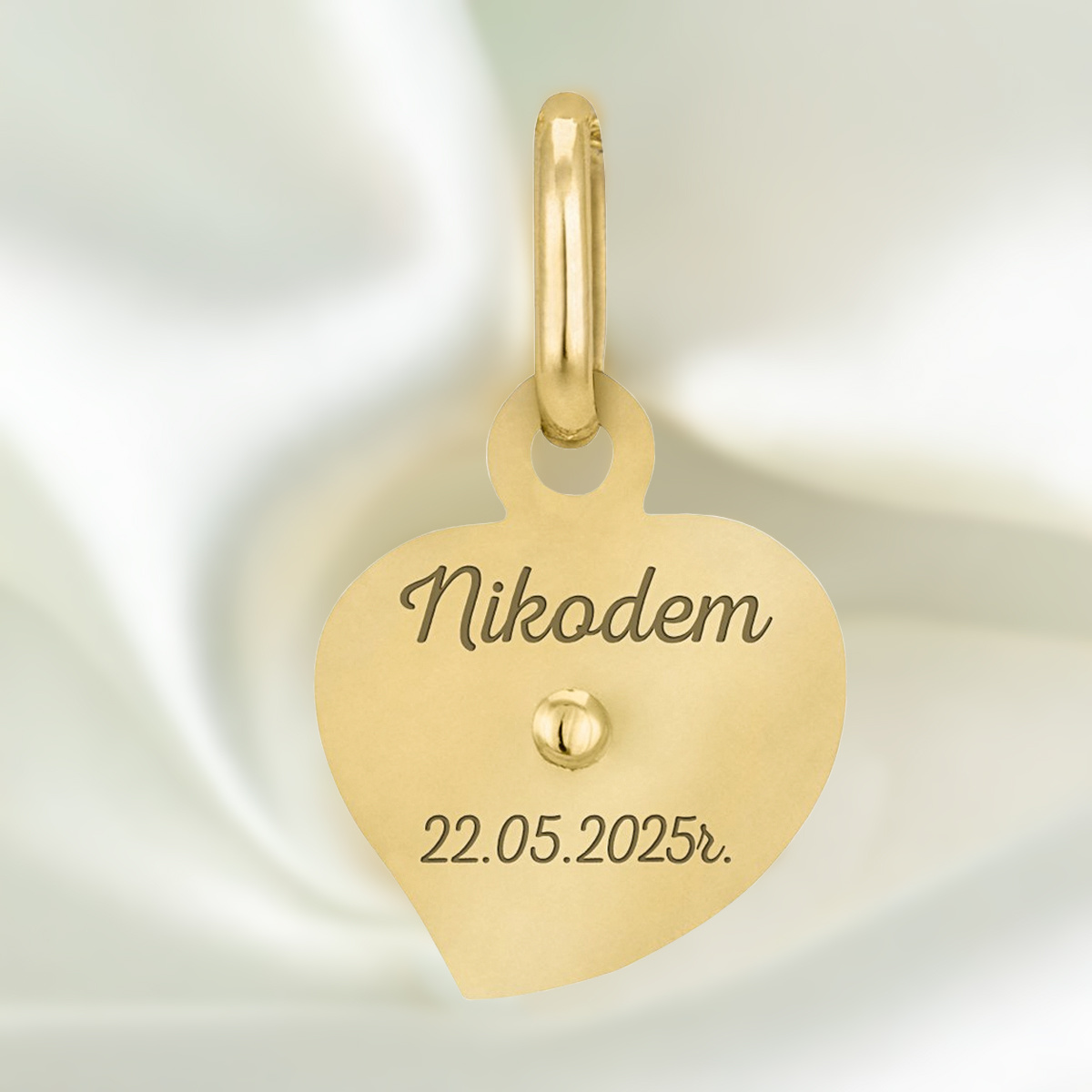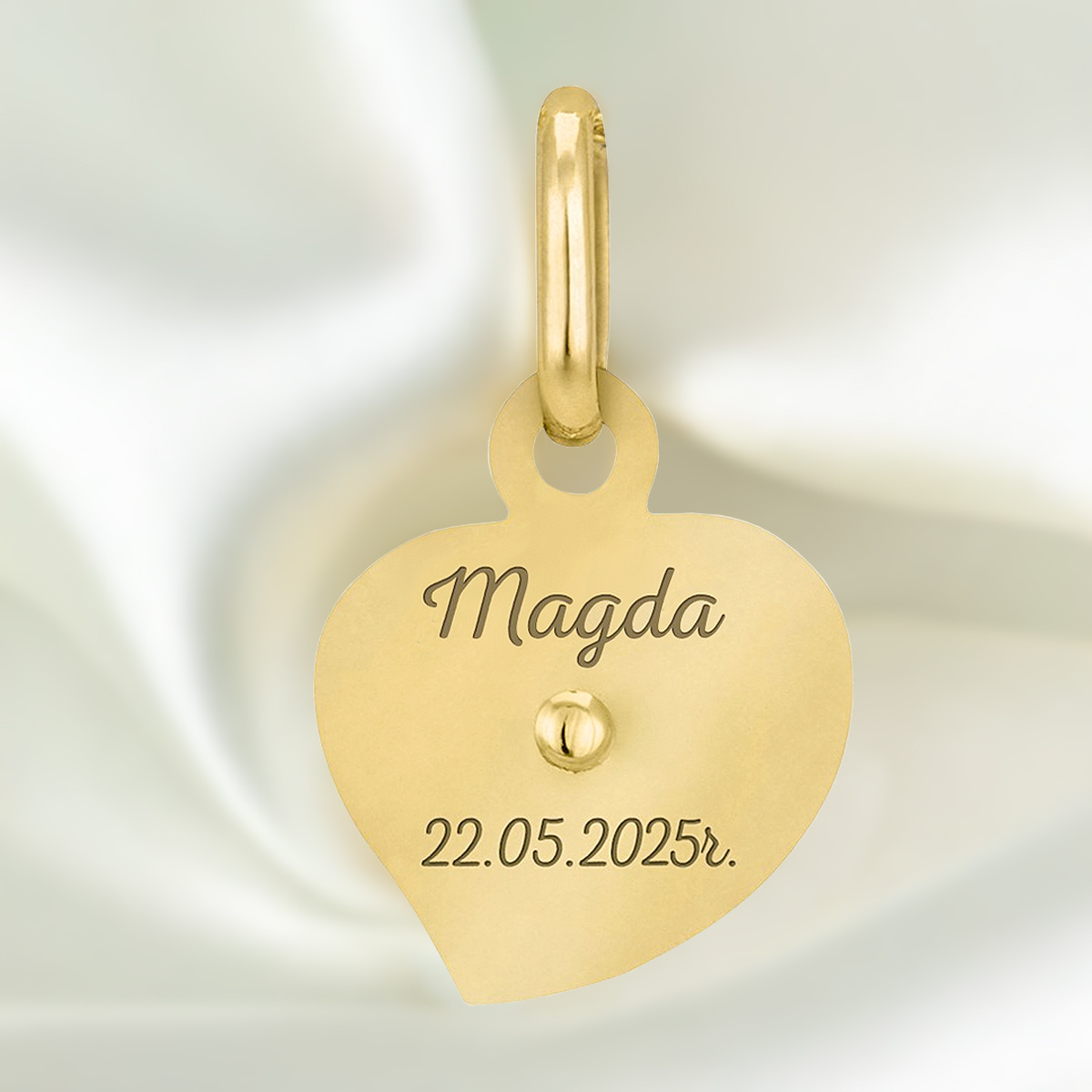 Medalik wykonany jest w całości ze złota. Ma kształt serca z ozdobnym szlifem. W środku jest wypukły wizerunek Matki Boskiej Częstochowskiej. Medalik jest niewielkich rozmiarów, dlatego pięknie będzie prezentował się na dziecku.