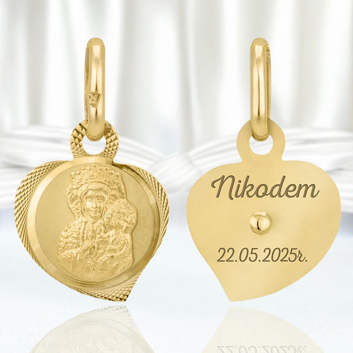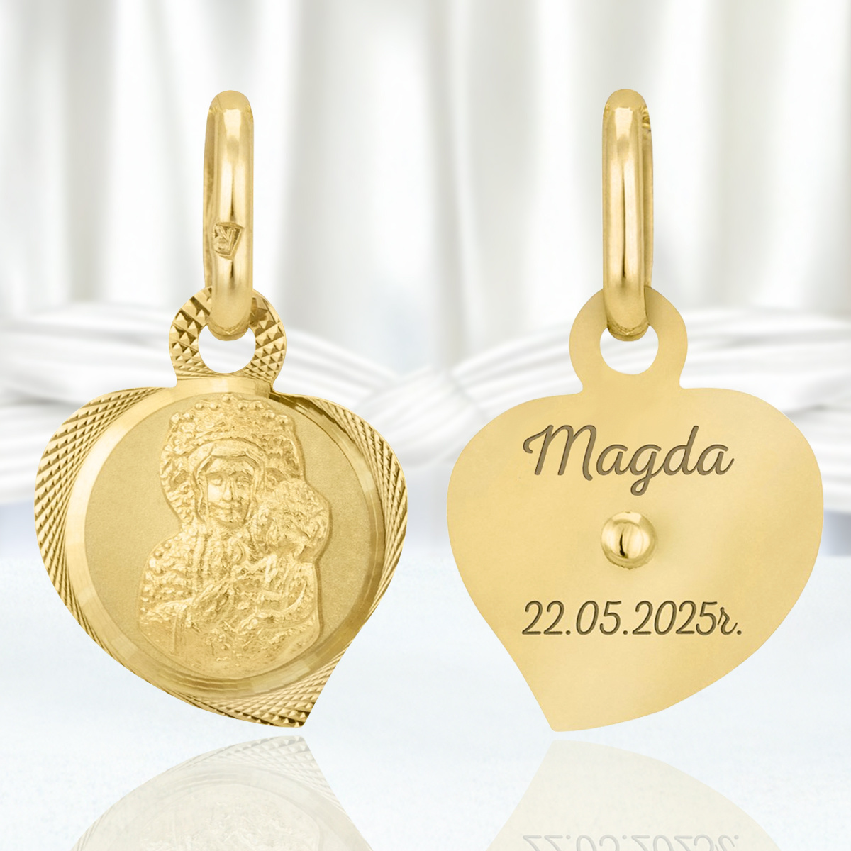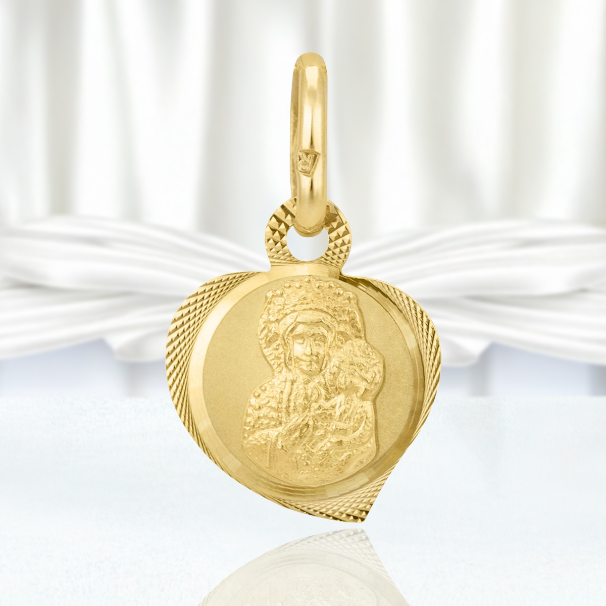 - Złoty medalik w kształcie serduszka z wizerunkiem Matki Boskiej Częstochowskiej