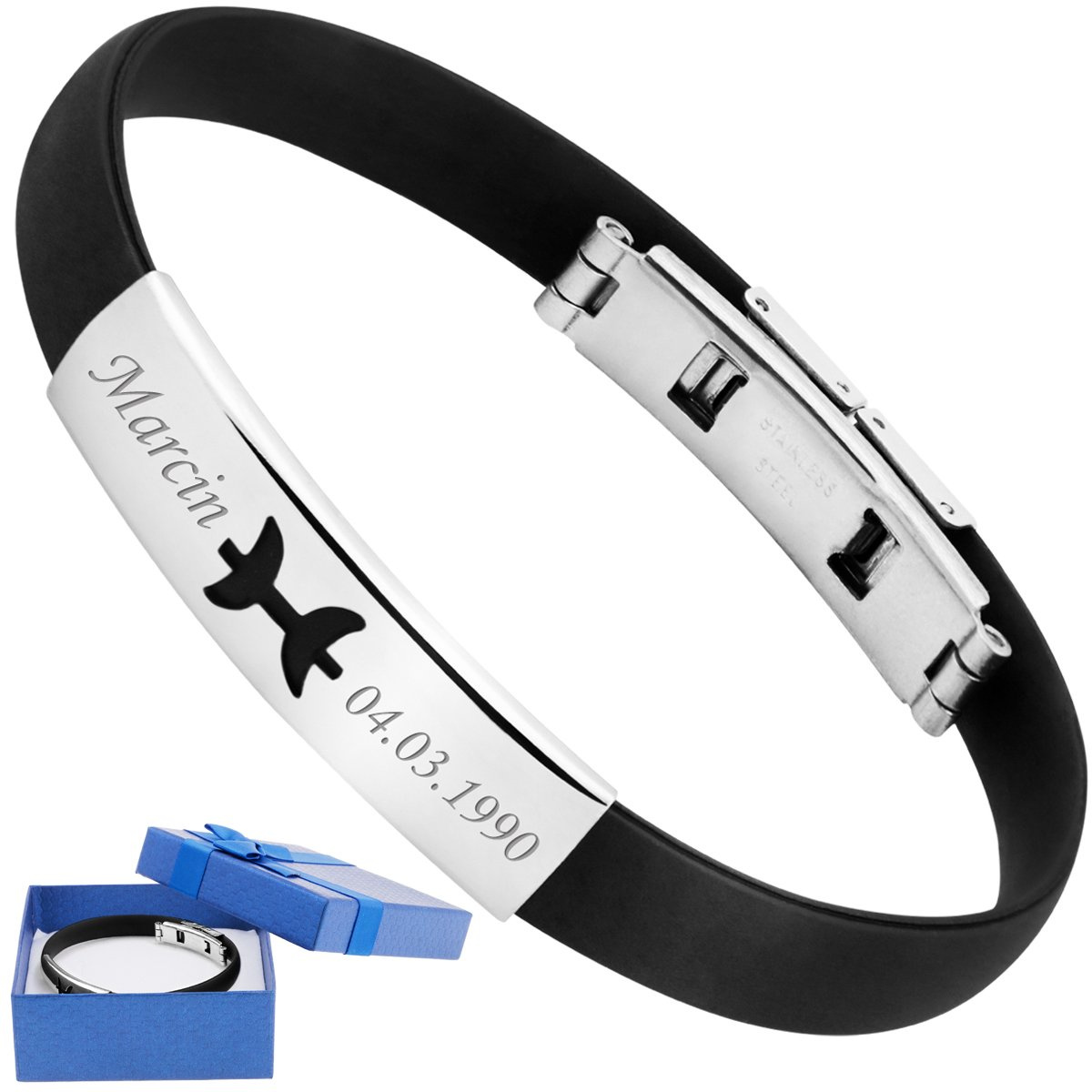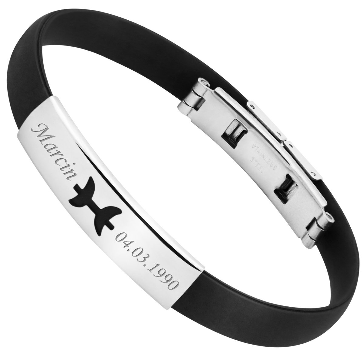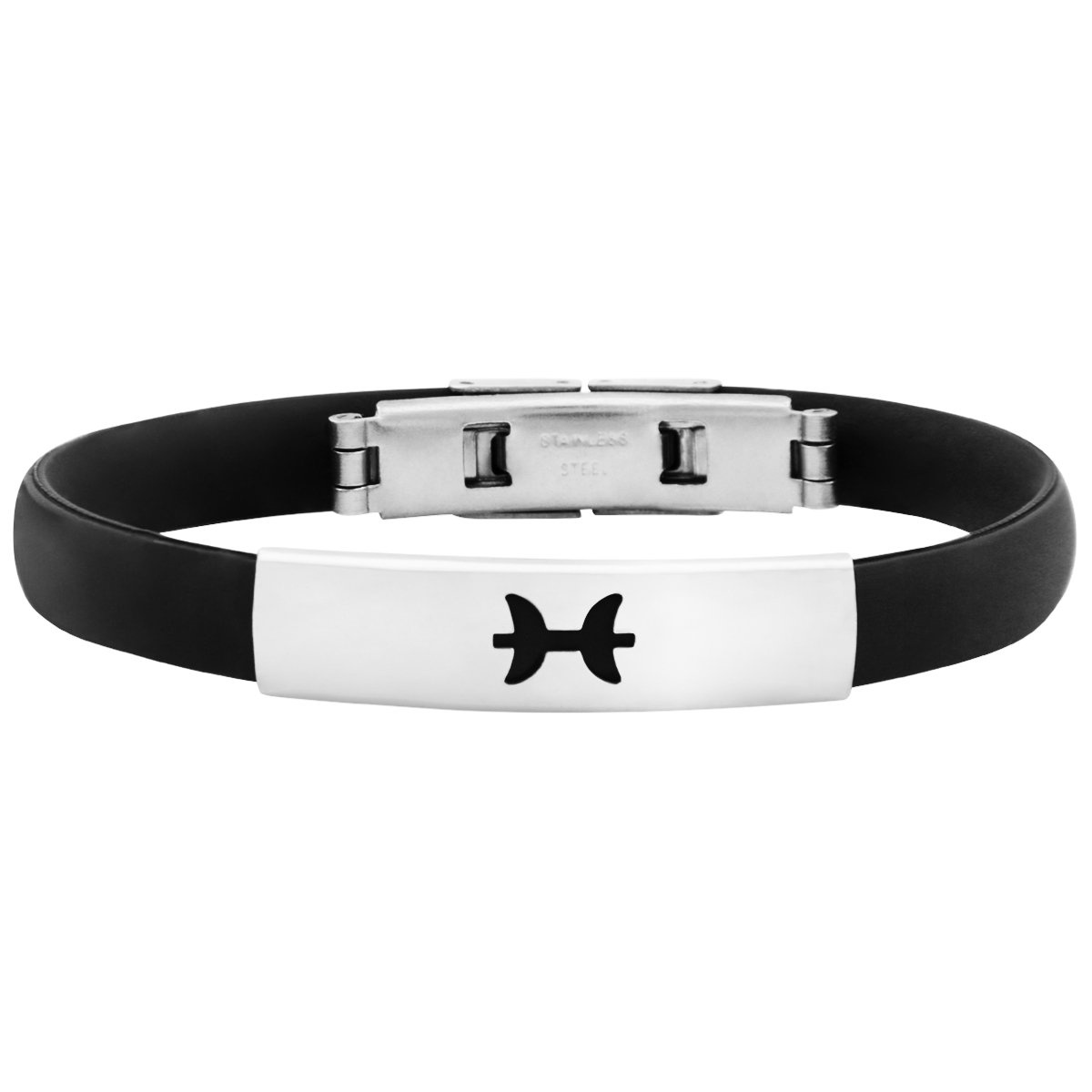 Proponujemy Państwu wyjątkową bransoletkę wykonaną ze stali szlachetnej 316L i kauczuku. Została ozdobiona dodatkowo znakiem zodiaku wyciętym w blaszce, w tym przypadku są to RYBY.