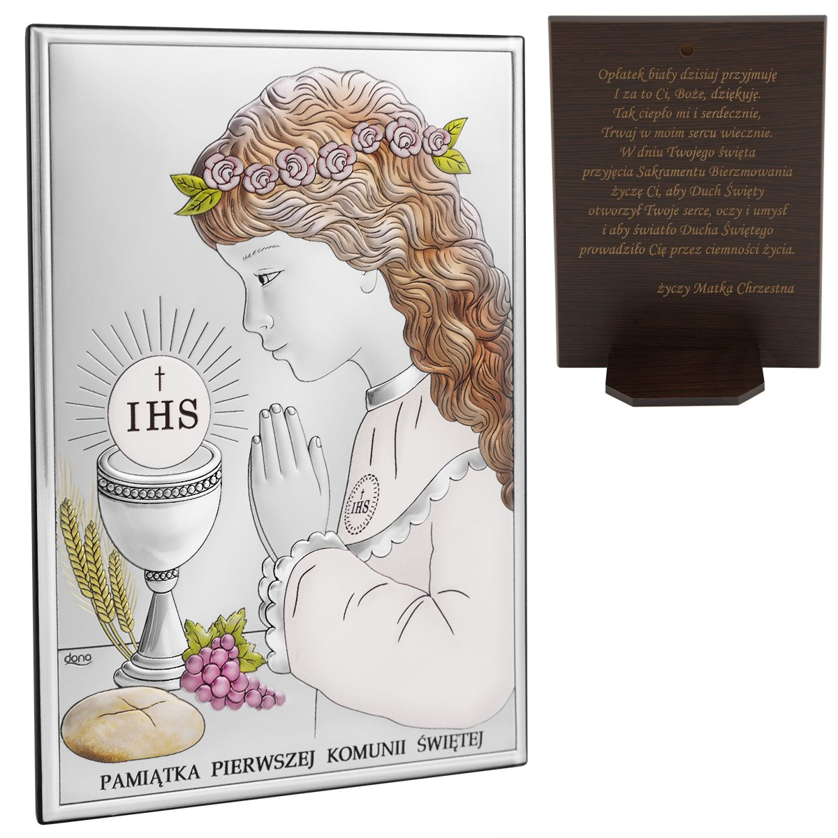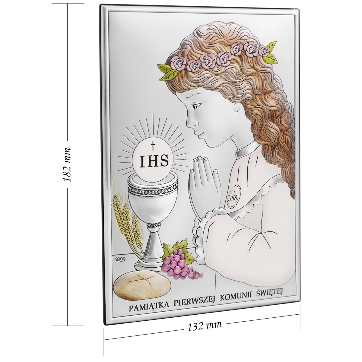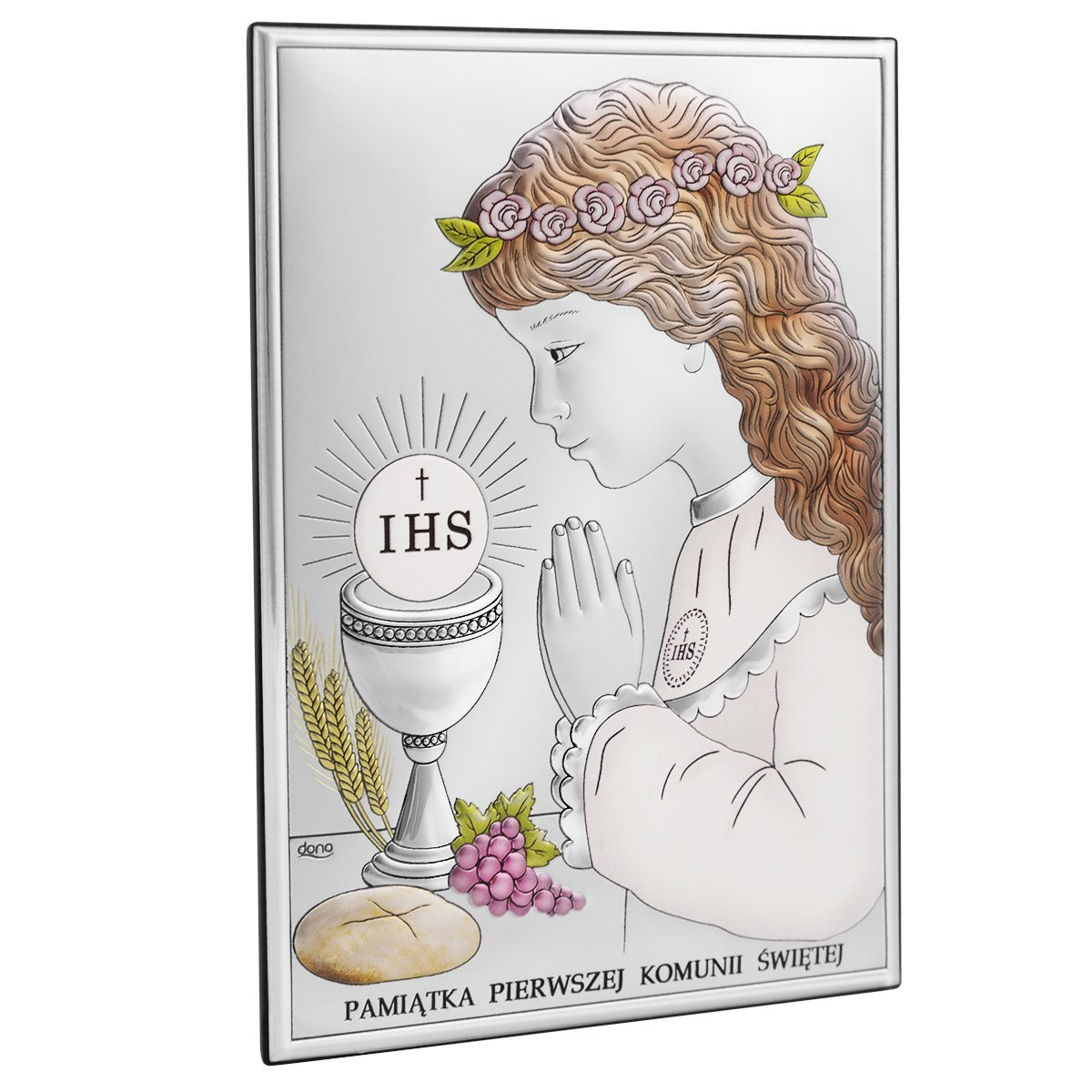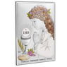 Proponujemy Państwu piękny obrazek przedstawiający dziewczynkę przyjmującą Komunię Świętą. Płaskorzeźba wykonana jest w technologii bilaminatu, co oznacza że na blachę z aluminium jest nałożona warstwa srebra pr. 925. Warstwa srebra zabezpieczona jest specjalnym lakierem ochronnym, dzięki któremu nie czarnieje i zachowuje swój blask. Zostały również naniesione delikatne kolory.