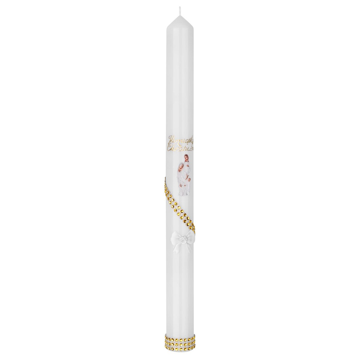 Świeca dla dziewczynki i chłopca w tonacji złotej z napisem Pamiątka Chrztu Św. Na powierzchni został umieszczony motyw Świętej Rodziny ze złotymi cyrkoniami.
